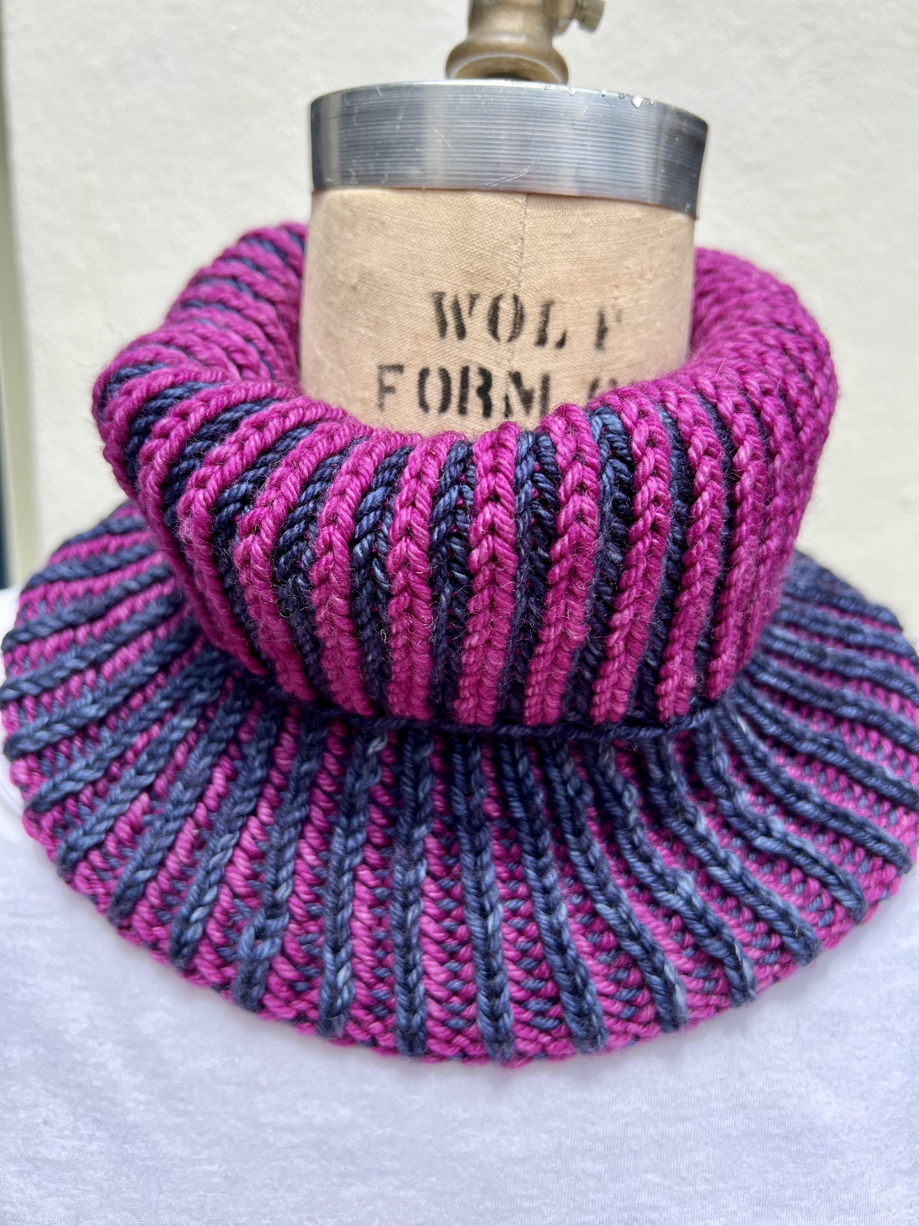 Brioche knitting projects are everywhere! Seize the day and learn how to knit 2-color brioche, in the round to create a reversible cowl. The brioche stitch produces a lofty, ridged fabric that resembles the (knit 1, purl 1) rib stitch. It is fluffy and luxurious!