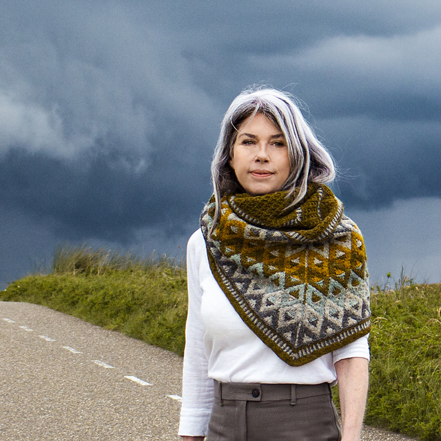 This is a triangular shawl that is worked top-down from the center out, starting with a classic Garter Tab Cast On. The shawl features narrow bands of 1×1 color created using the stranded technique. The eye-catching border of the shawl is worked using the mosaic technique, holding only one strand of yarn on every row.