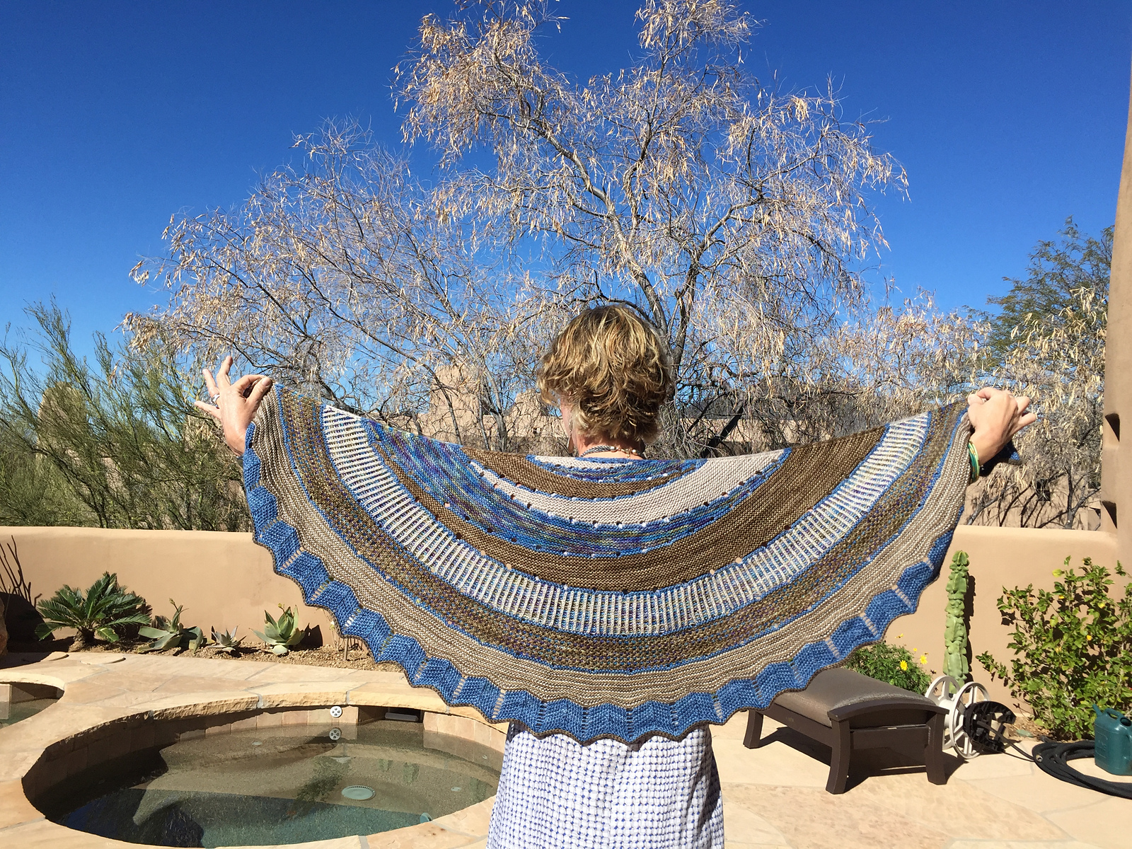 Exploration Station is a dramatic shawl knit in four colors. While knitting this top down, semi-circle shawl, you will learn Stephen West’s shortcut rows, two-color brioche ribbing, slipped stitches, stripes, and a chevron border.